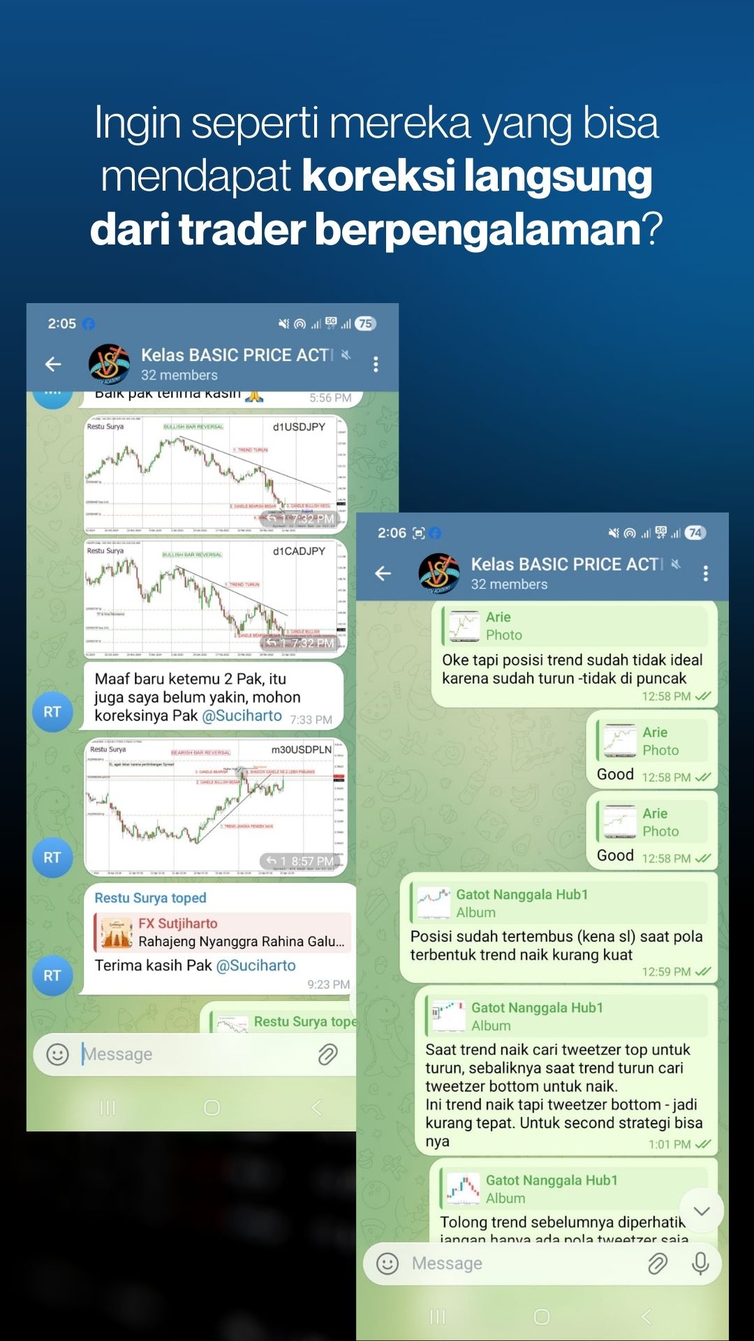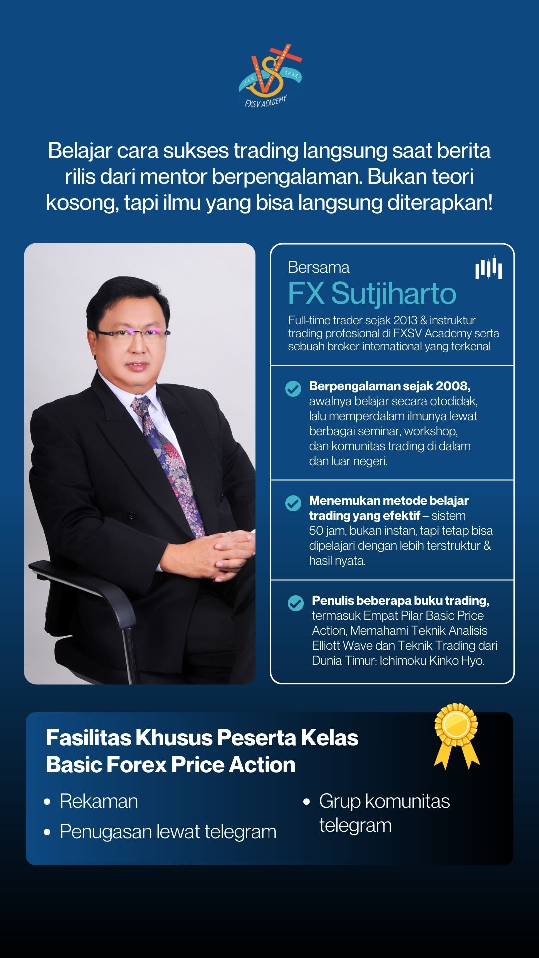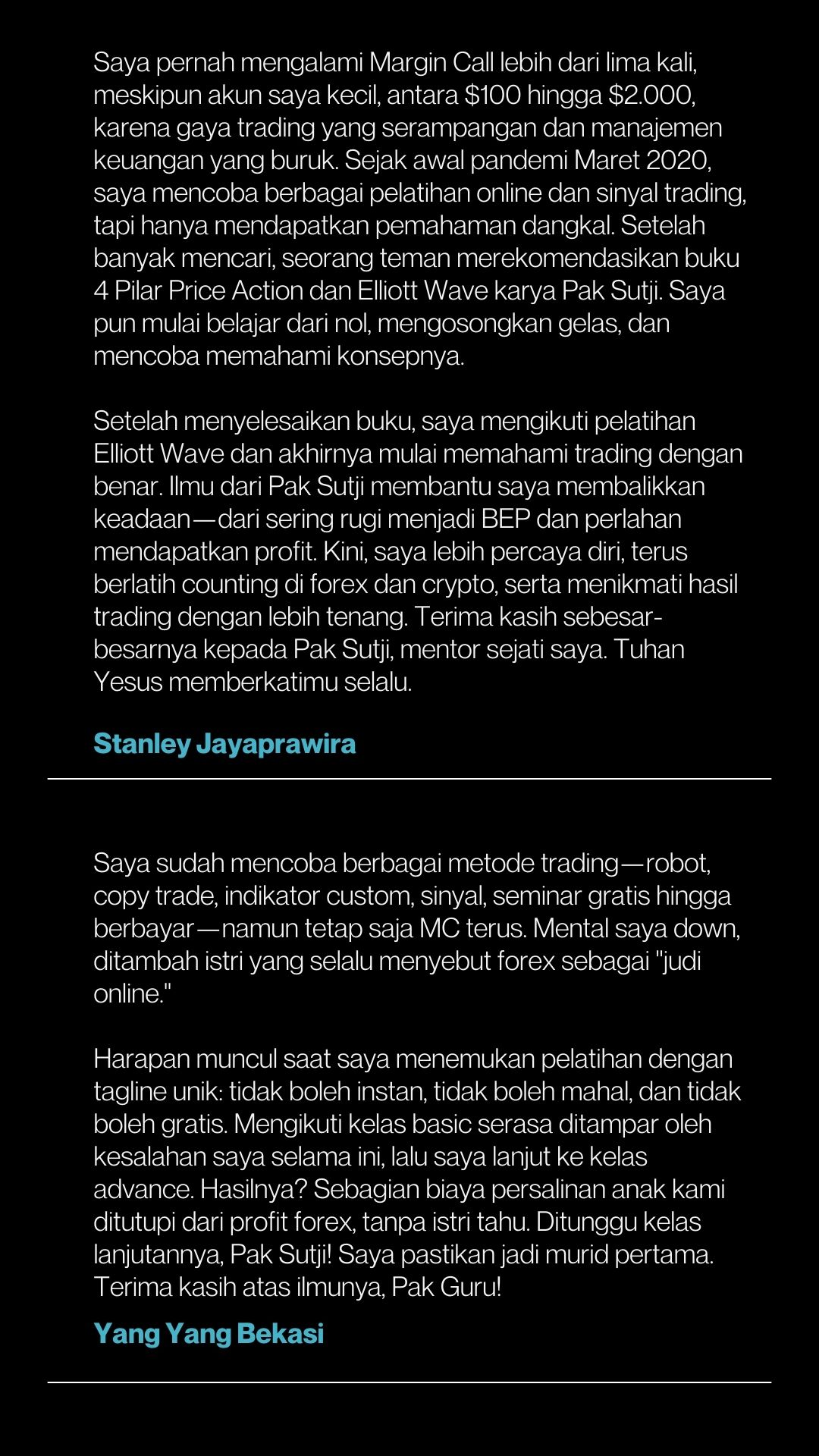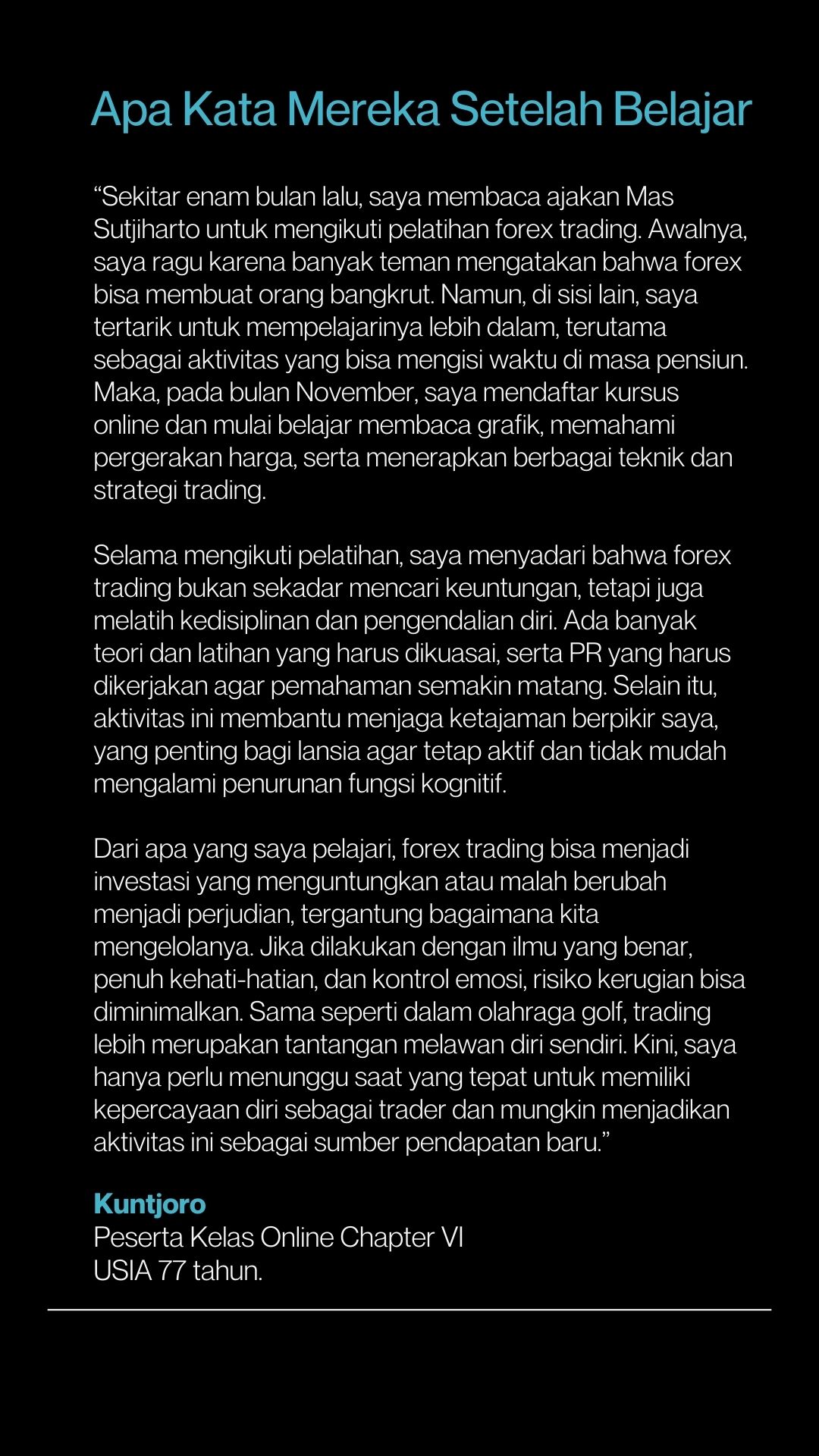 Kelas intensif 20-23 Kali pertemuan untuk pelajari teori, penugasan dan koreksi langsung dari trader 13 tahun pengalaman